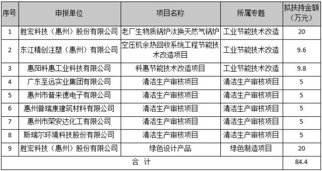 在奖励资金数额方面,公海彩船科技凭借老厂生物质锅炉汰换天然气锅炉和绿色设计产品两项目共计获得40万元,东江精创注塑(惠州)有限公司和惠阳科惠工业科技有限公司则分别凭借各自的工业节能技术改造项目获得9.6万元和9.8万元奖励,惠州普瑞康建筑材料有限公司等5家企业的清洁生产审核项目均获得5万元嘉奖。